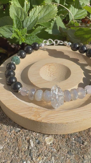 Aspire, a singular masterpiece embodying the ethereal essence of ambition. Crafted with intention, this exquisite piece features grounding shungite, that may help protect against negativity, harmoniously entwined with radiant Herkimer diamonds and enveloped in the embrace of genuine sterling silver. This extraordinary creation has been created with Precision fused in a harmonious blend of soft rose quartz and faceted jade, delicately intertwined with moonstone to evoke a sense of emotional equilibrium.